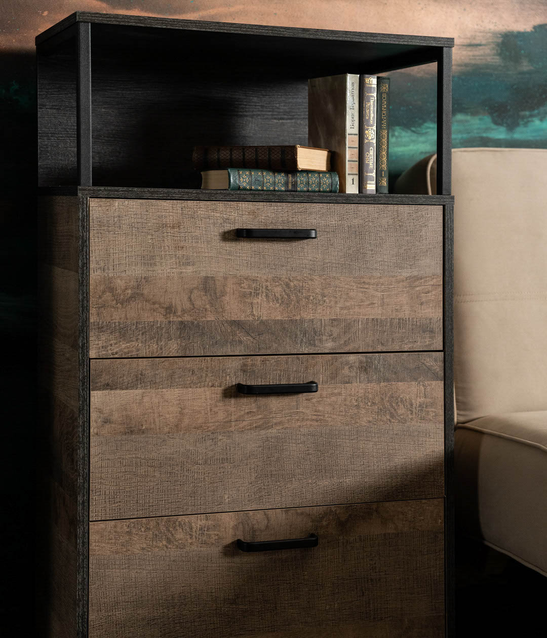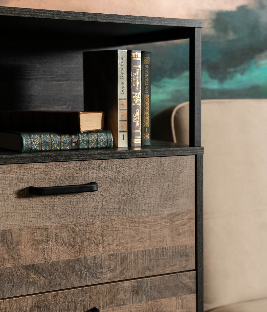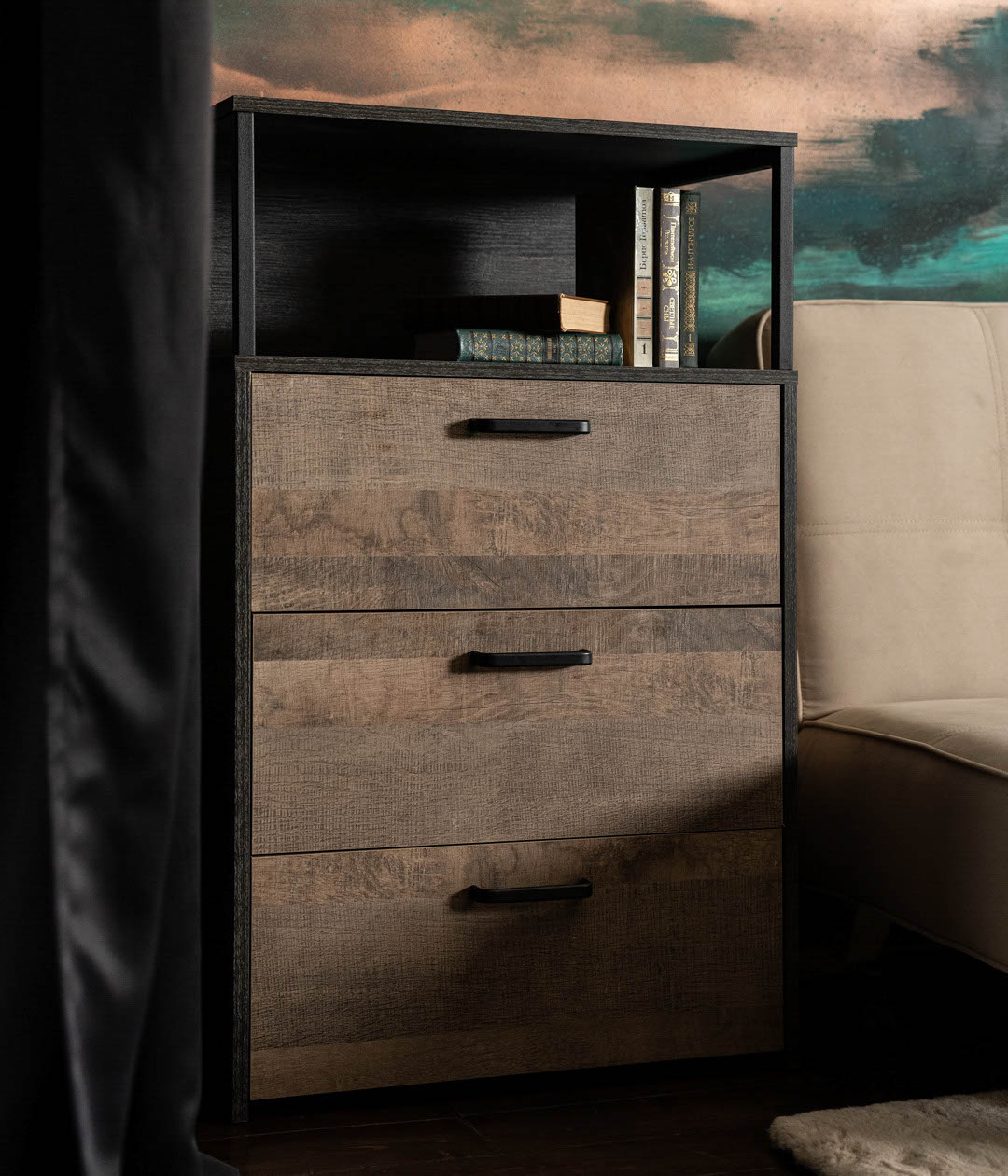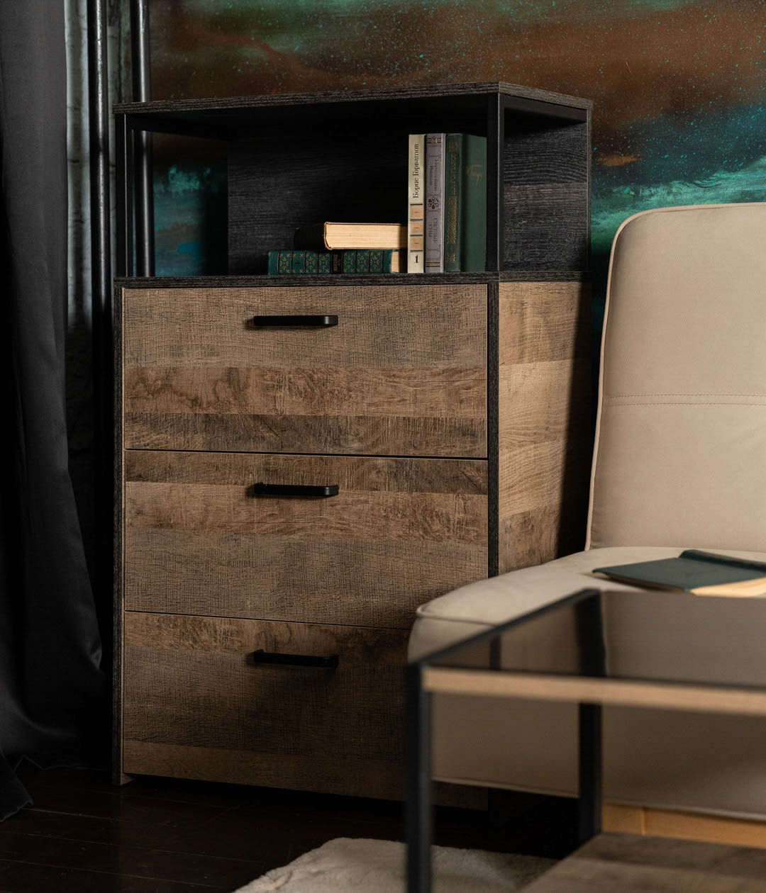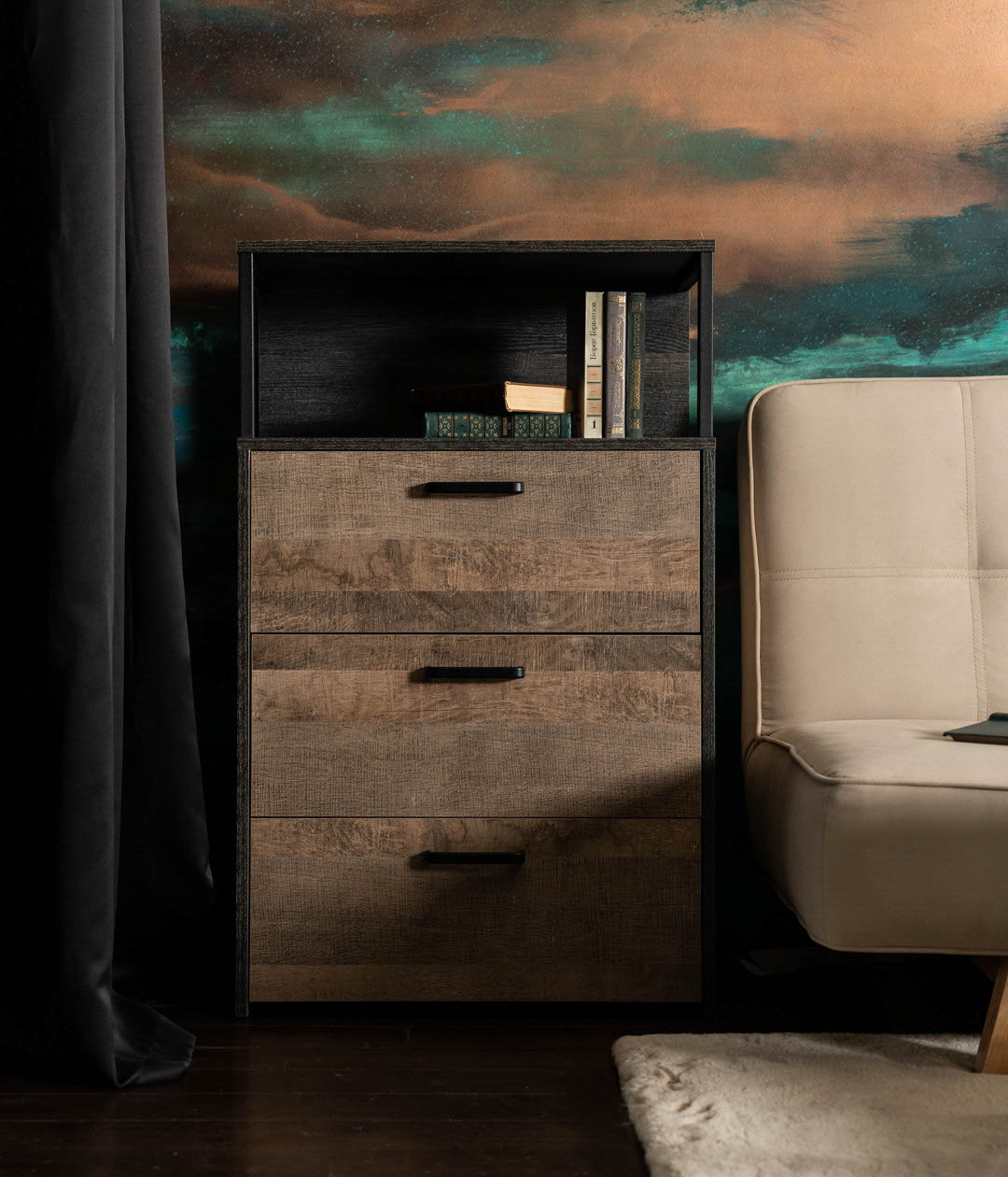 Стильный комод Трувор удачно дополнит систему хранения. Ящики с доводчиками плавно выдвигаются на всю глубину, открывая полный обзор содержимого, поэтому в них легко найти любую вещь.Сочетание цветов и простых форм является главным акцентом дизайна комода.