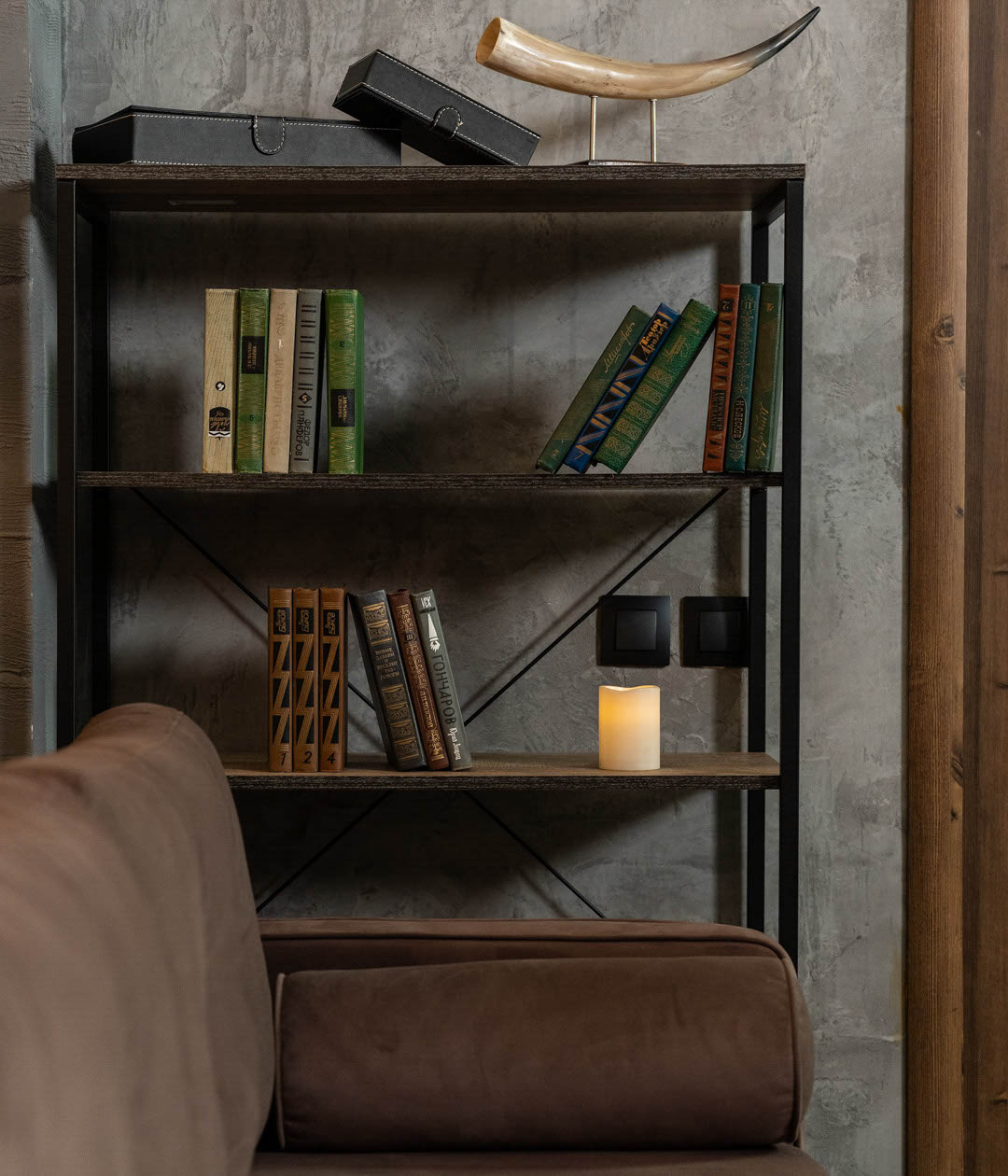Брутальный дизайн модели будет отлично сочетаться с интерьером в стиле лофт, служит системой хранения и декором.