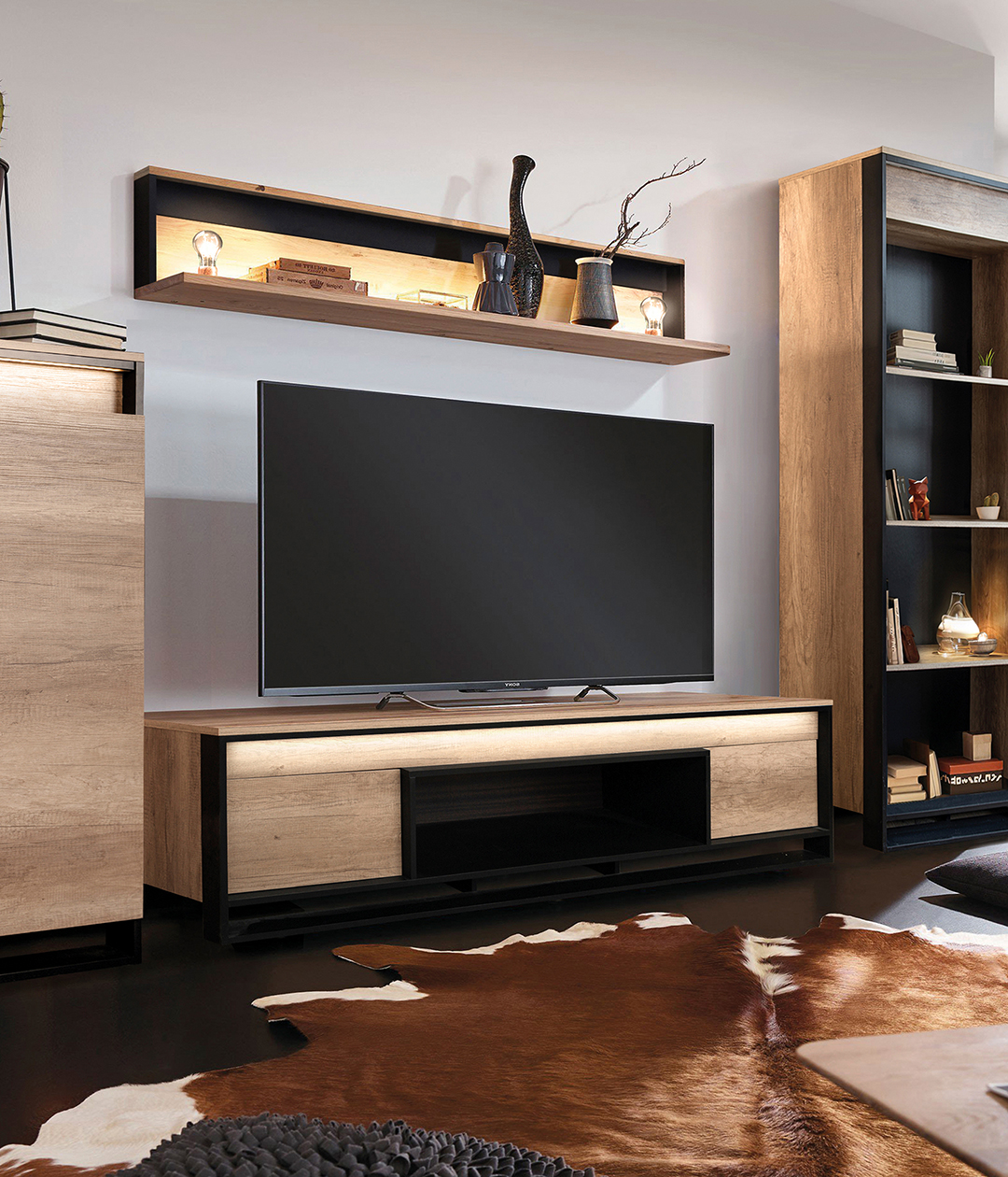Тумба Каньон станет украшением ТВ-зоны гостиной. Элегантная простота и лаконичность форм подчеркивает уютную атмосферу. На крышке достаточно места для размещения не только ТВ, но и предметов декора. Тумба отличается хорошей вместительностью, поскольку оборудована открытыми и закрытыми полками.