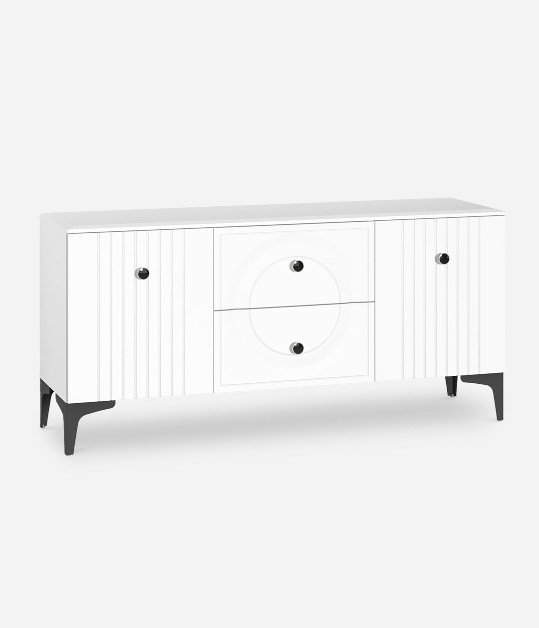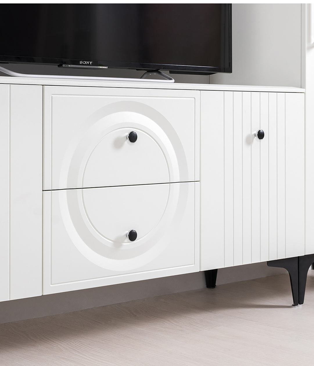 ТВ-тумба Валенсия расширит систему хранения гостиной и поможет разместить широкоформатный монитор. Комбинированное наполнение включает отделения с полками за распашными дверцами и два выдвижных ящика. Дверцы и ящики оснащены доводчиками, которые обезопасят от хлопков и резкого закрывания. Фасады украшены декоративной фрезеровкой в виде строгих прямых линий и геометрических фигур.