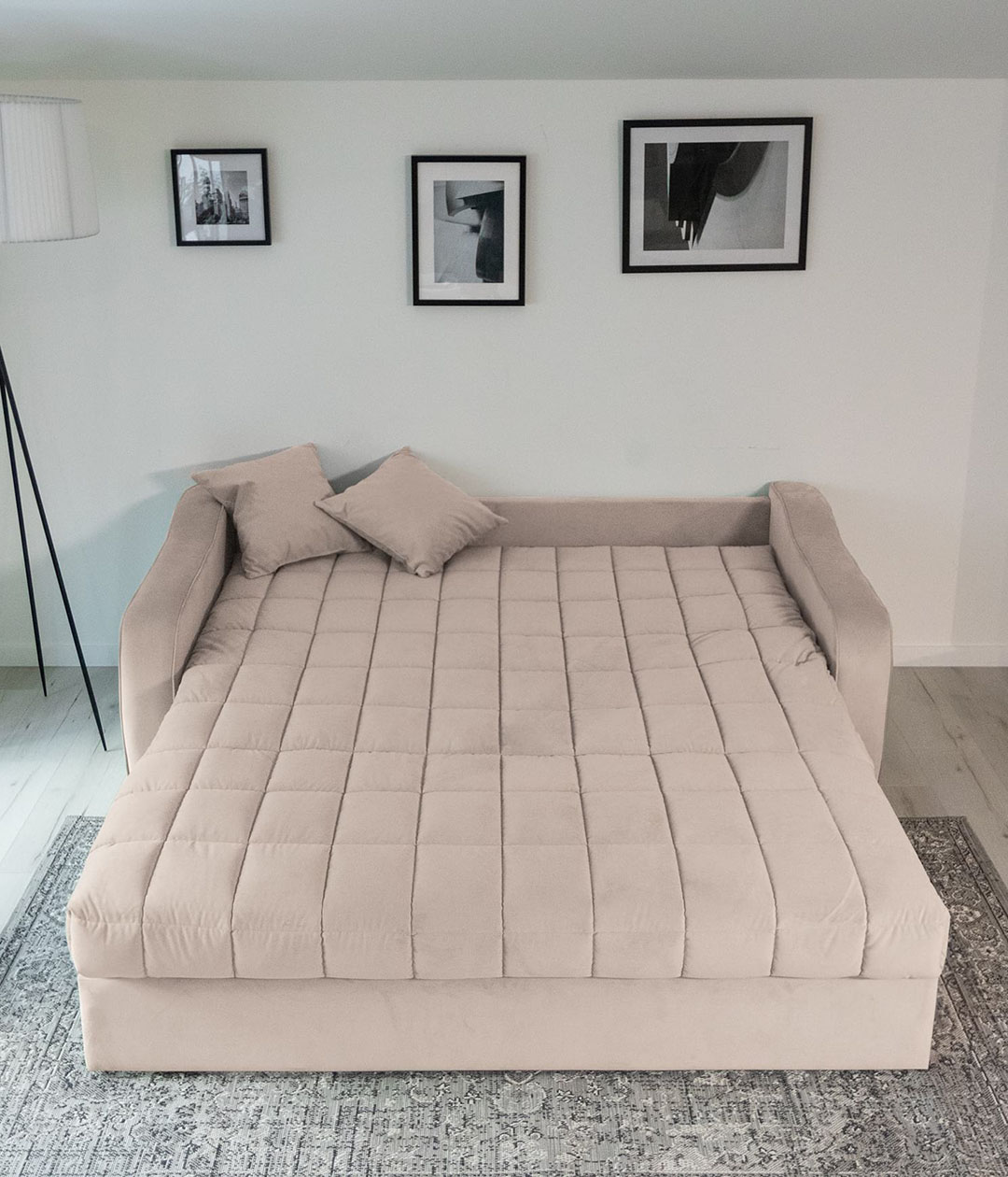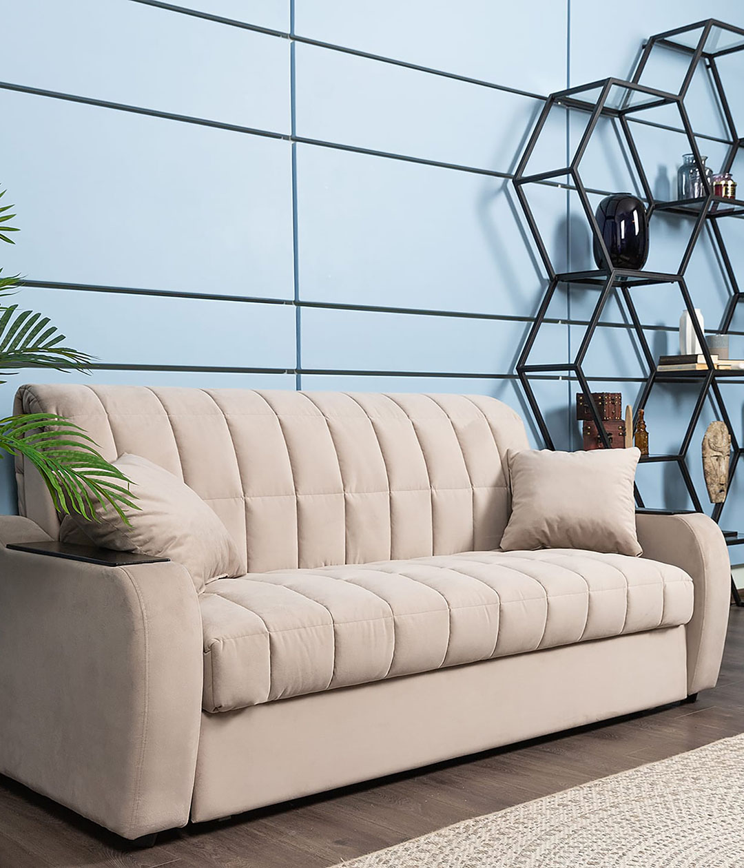 Диван-аккордеон Вентура — отличный выбор для ежедневного использования. Он легко раскладывается в ровное спальное место, обеспечивающее комфортный сон и отдых. Ткань обивки имеет нежную и бархатистую структуру, но достаточно практична и проста в уходе. Классический стиль делает диван универсальным для любого интерьера, сочетая в себе удобство и элегантность.