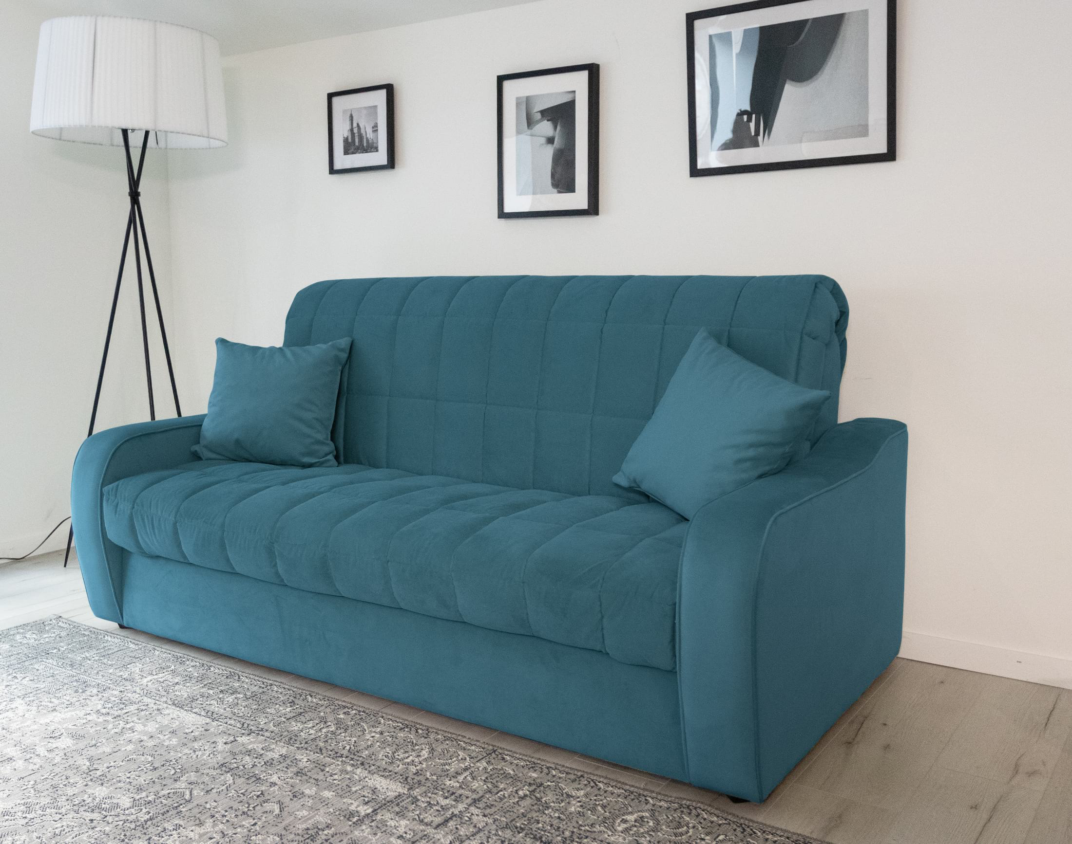 Диван-аккордеон Вентура — отличный выбор для ежедневного использования. Он легко раскладывается в ровное спальное место, обеспечивающее комфортный сон и отдых. Ткань обивки имеет нежную и бархатистую структуру, но достаточно практична и проста в уходе. Классический стиль делает диван универсальным для любого интерьера, сочетая в себе удобство и элегантность.