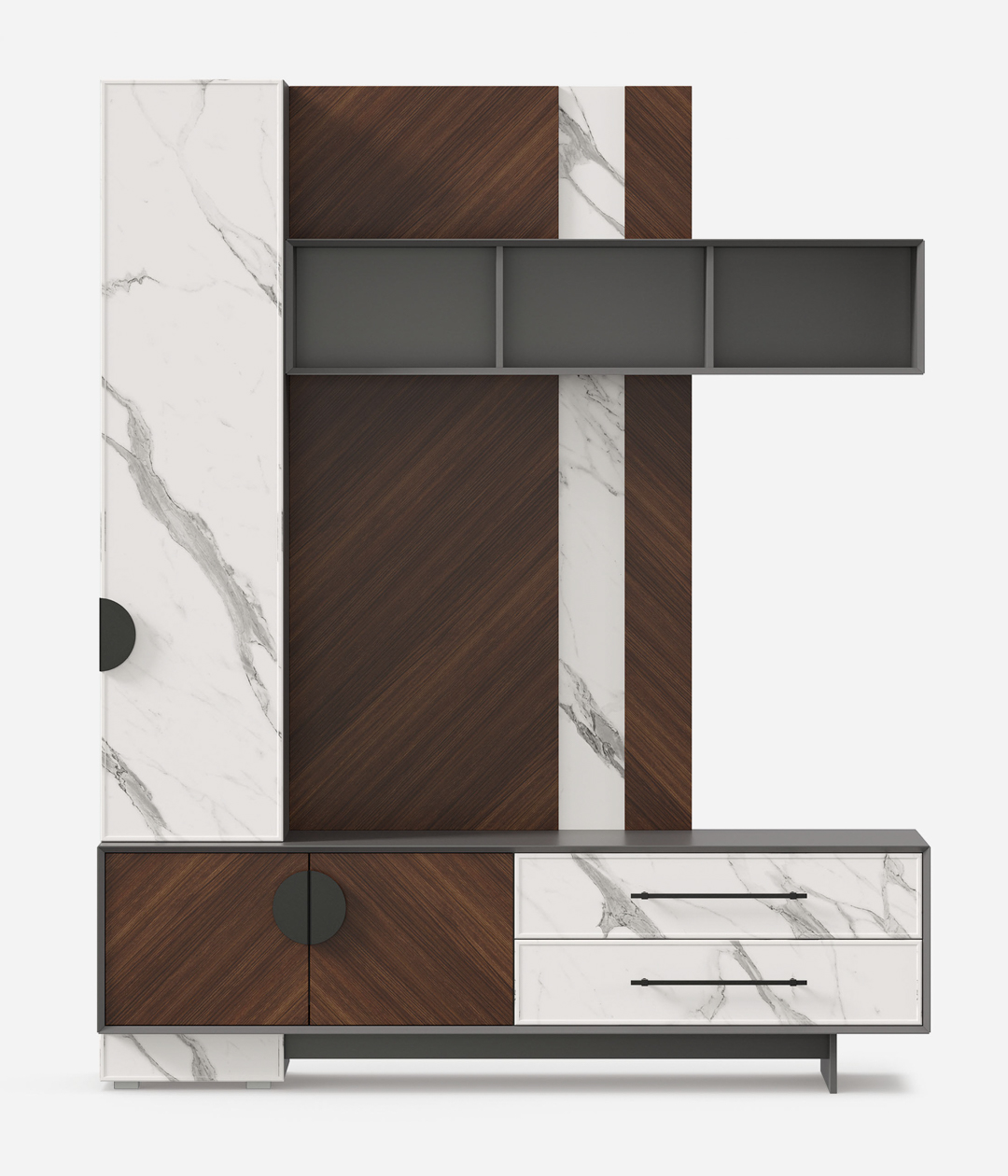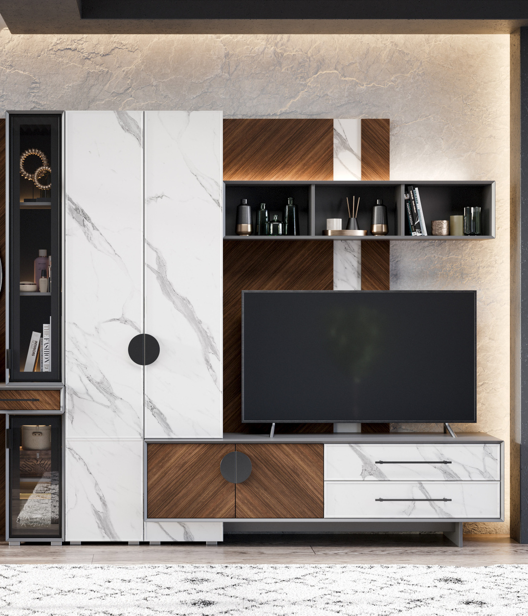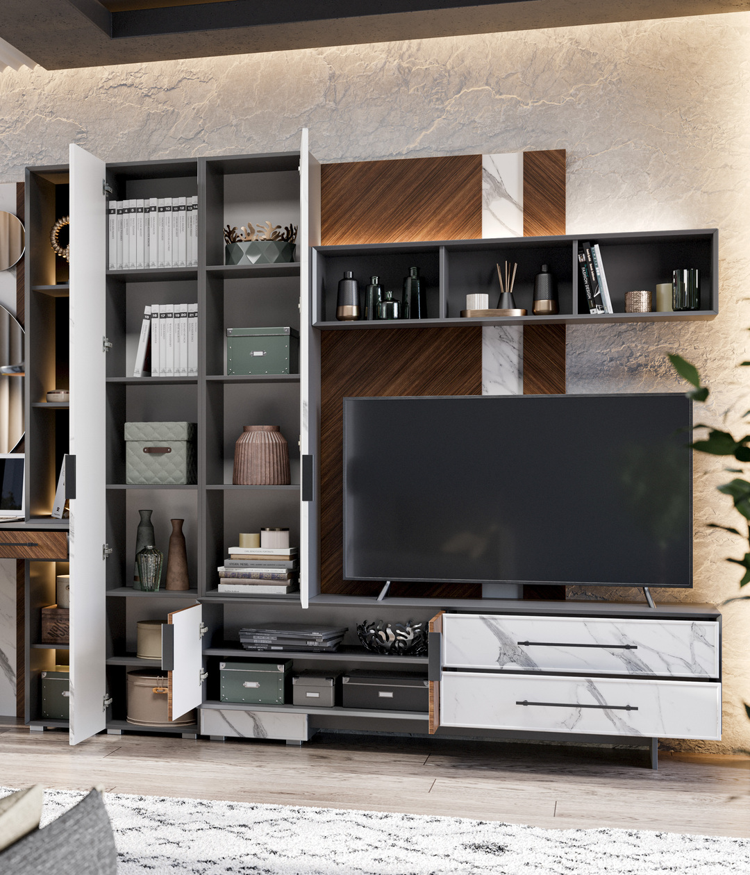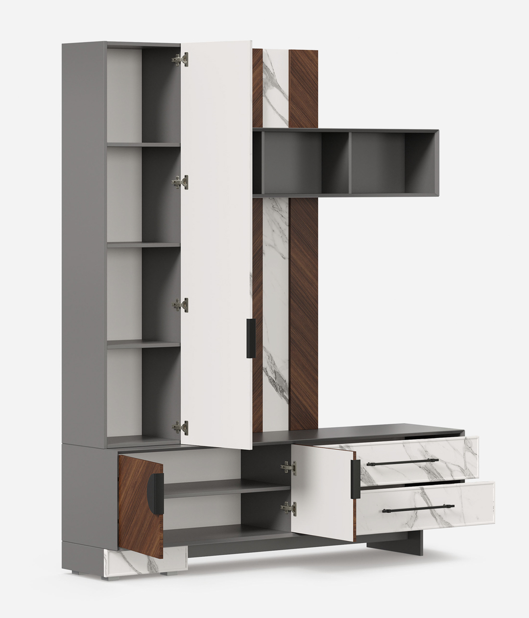 Функциональная и надежная ТВ-тумба Вилена — это залог уютного и аккуратного интерьера. Комбинированное наполнение предусматривает отделения за распашными дверцами, а также ящики полного выдвижения.